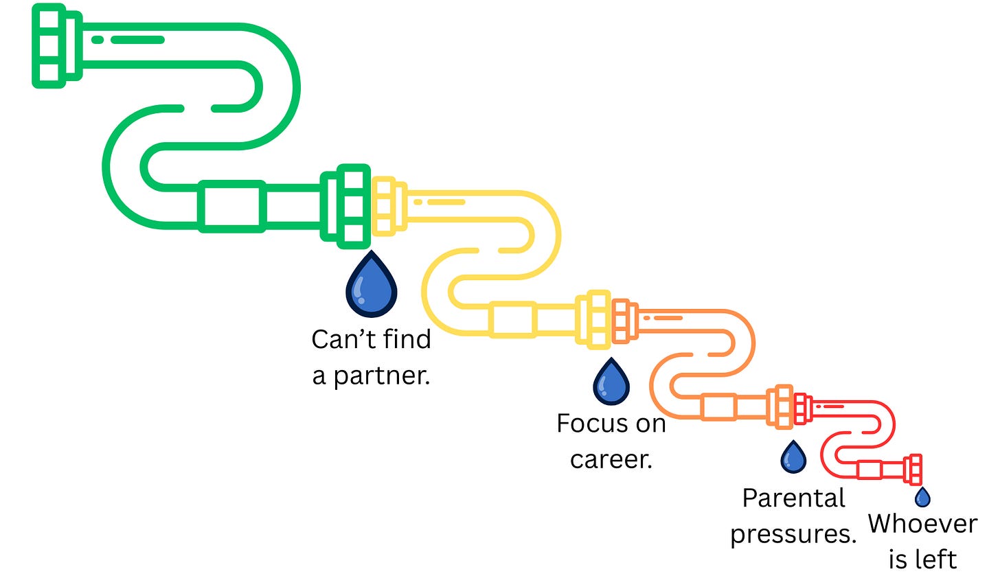 We might view raising a family as a pipeline. At various points along the way, people who might otherwise have kids or have more kids “leak” out of the pipeline. A prospective parent may not be able to find a partner to raise kids with. If they do, they may not see raising children as feasible or desirable. Even if they did, they may choose to have only one kid so they can focus their energies on providing the best possible life for them, rather than take on the seemingly unmanageable task of meeting escalating parental expectations for a second child. Even if they want to have more than one kid, they may have started their family later in life and simply run out of time before having as many children as they wanted. Potential parents leak out of the child rearing pipeline at all sorts of points for a variety of reasons, and no one policy is going to patch every hole.